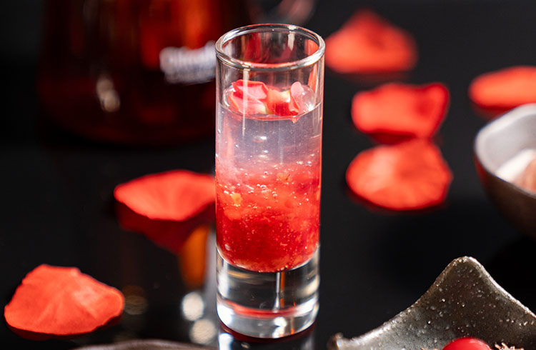 ストロベリーやラズベリーのコンポートを、鮮やかな層に仕立てました。爽やかなトニックジュレがよりベリーの甘酸っぱさを引き立てます。