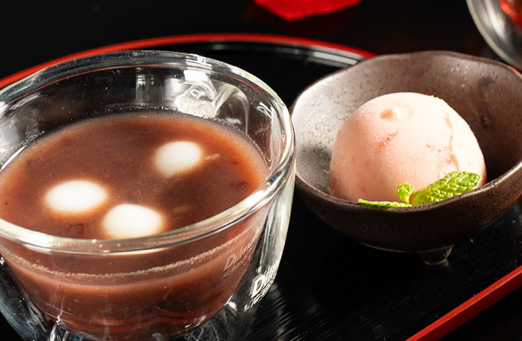 北海道産小豆のぜんざいに、クーベルチュールのミルクチョコレートを合わせた一品。和と洋が織りなす、当ホテルアフタヌーンティーの名物スイーツです。ジェラートは甘酸っぱいいちごの風味となめらかな口どけ。果肉の食感が残る、お口直しにぴったりの一品。