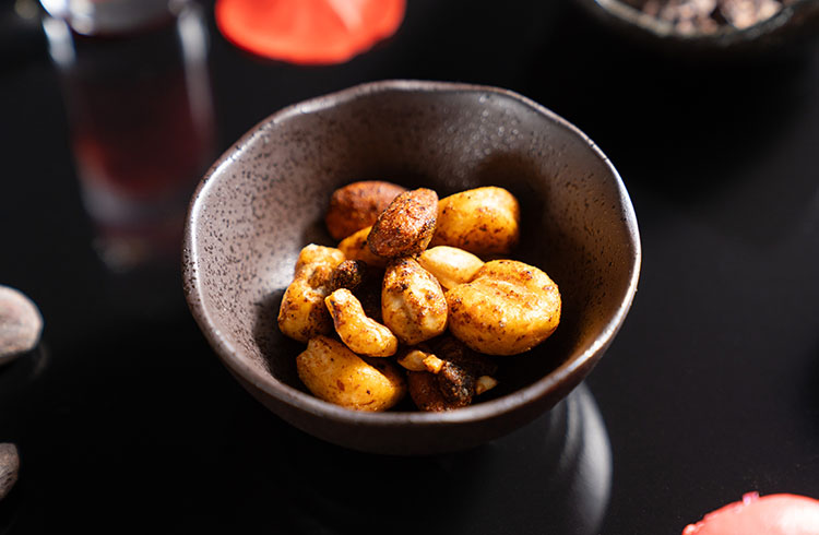 チリパウダー、パプリカパウダー、ブラックペッパーなど数種類の香辛料を使用し、スパイシーな香りが広がる人気のスモークナッツ。本アフタヌーンティーのアクセントとしてお楽しみいただけます。