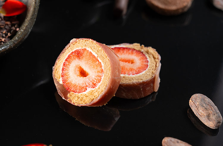 いちごとチーズを全粒粉パンでつつみ、生ハムをまいた甘じょっぱさがクセになるロールサンド。