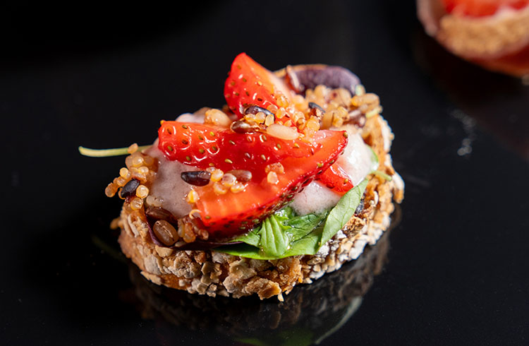 ドライフルーツ入りのブレッドに、キヌアといちご、ストロベリーヨーグルトソースを合わせたヘルシーな一皿。